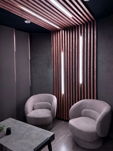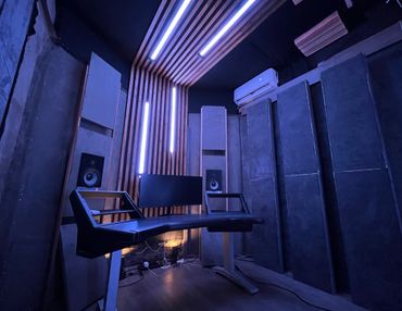 Our brand new, modern recording studio with acoustic treatment and floating flush mounted speakers including sleek studio furniture with light beams and wood slat design.