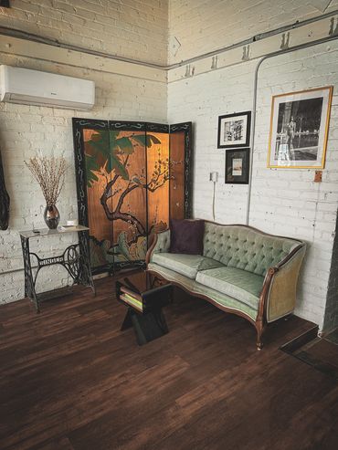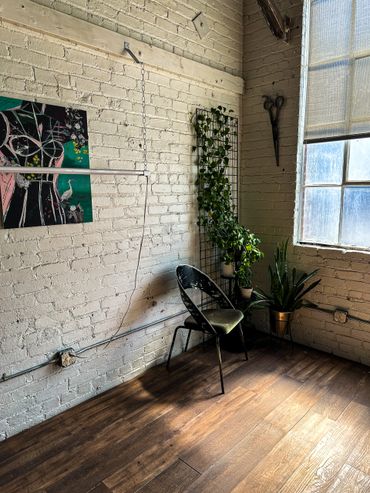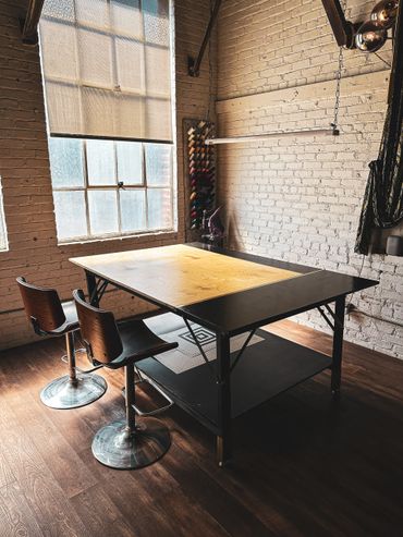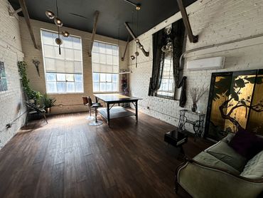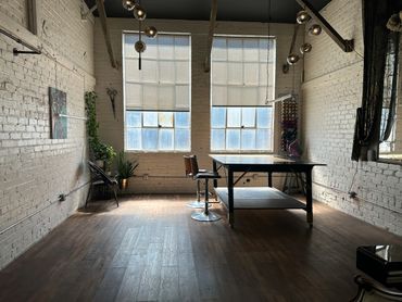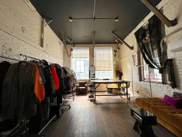 Naturally sunlit room with a vintage feel including a large workstation table, available as a flex room. The Fashion Studio is a closed room, directly attached to The Warehouse. The room is able to be entirely cleared out or rearranged to fit your needs, which makes it perfect as a glam room, workstation, private lounge area, fitting or dressing room.