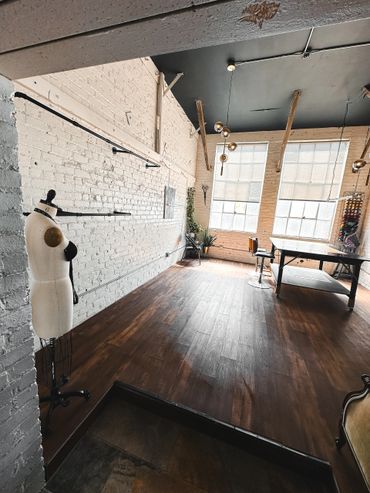 Natural sunlit vintage room with a large work surface available as a flex room. Good for fittings, glam rooms, workstations, dressing rooms, or private lounge area.
