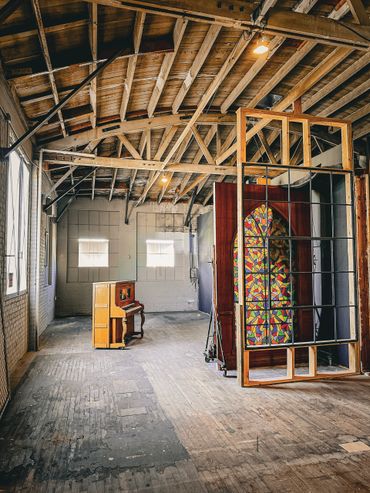 The North-East corner of The Warehouse features original windows and is divided from the main area by a portable stained glass partition, perfect for seclusion of activities such as catering prep areas or vendor booths.